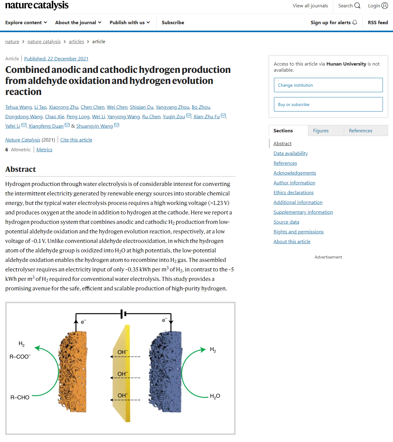 近日,bat365在线平台官网王双印教授开发出一种阴阳两极同时产氢的电化学双极制氢技术。相关研究以《Combined anodic and cathodic hydrogen production from aldehyde oxidation and hydrogen evolution reaction》为题发表在《自然-催化》(Nature Catalysis)期刊上。