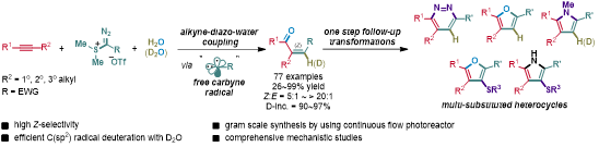 此外,Z式1,4-二羰基烯烃可以经由一步衍生化而高效构建一系列多取代(氘代)杂环化合物。这些方面的特点使得该反应具有十分重要的价值。