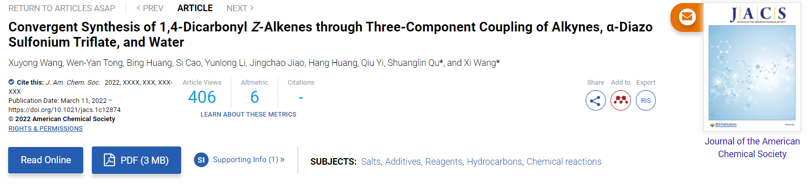近日,我校bat365在线平台官网王兮教授和瞿双林教授合作,实现了卡拜自由基这类活泼有机中间体的可控的炔烃官能团化。以“Convergent Synthesis of 1,4-DicarbonylZ-Alkenes through Three-Component Coupling of Alkynes,α-Diazo Sulfonium Triflate, and Water”为题,在线发表在《Journal of the American Chemical Society》。