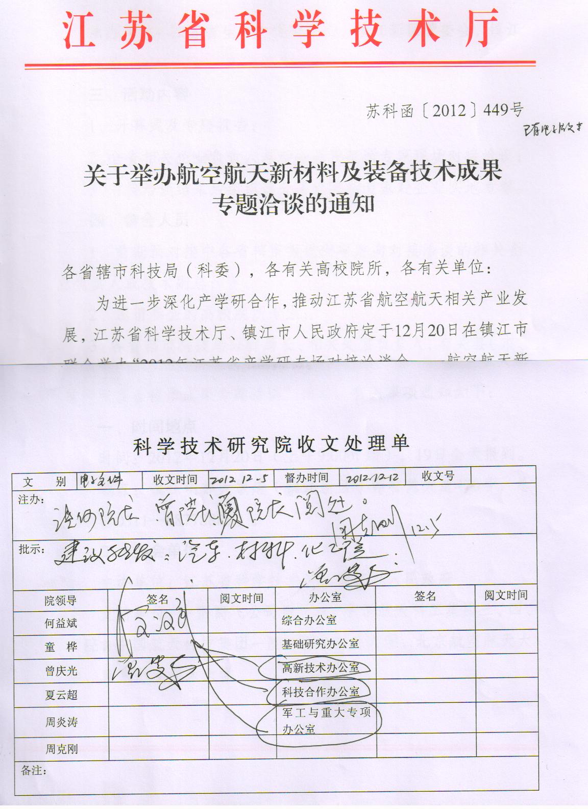 为进一步深化产学研合作,推动江苏省航空航天相关产业发展,江苏省科学技术厅、镇江市人民政府定于12月20日在镇江市联合举办“2012年江苏省产学研专场对接洽谈会——航空航天新材料及装备技术成果专题洽谈”活动。有关事项通知如下: