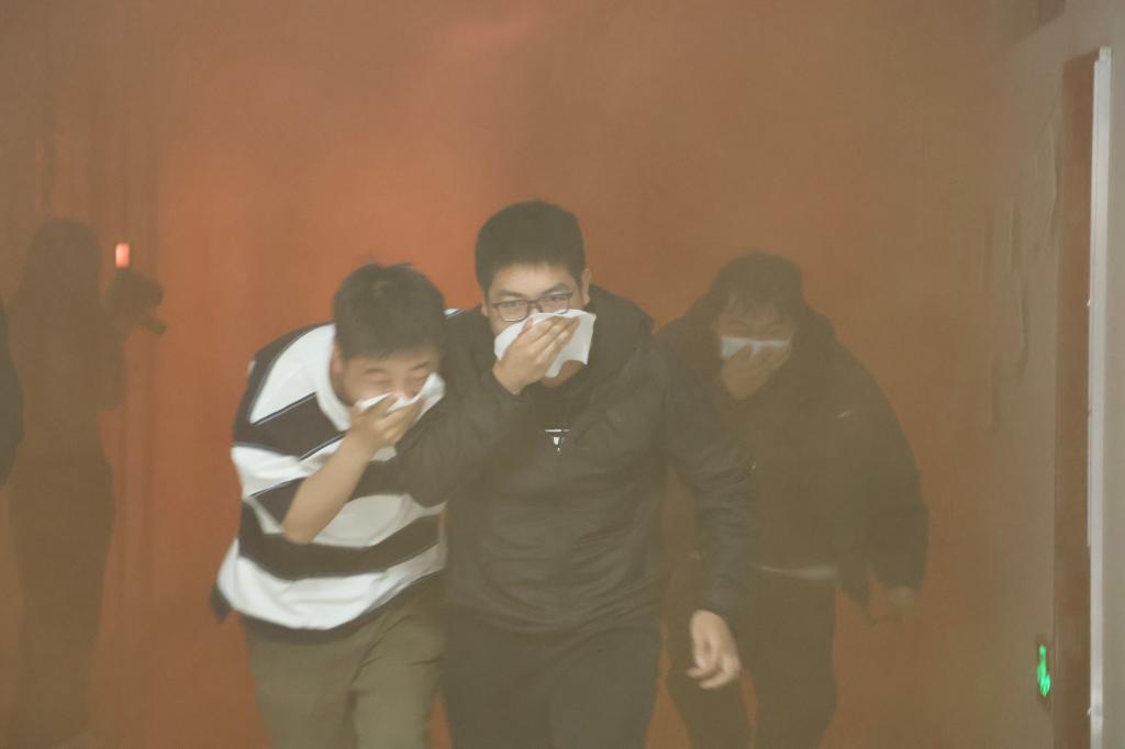 演练开始,烟雾四起,老师们合理分工,迅速进入状态,前往指定位置,引导学生安全撤离。“捂住口鼻”“弯腰前进”“小心脚下”的指引声此起彼伏;意外摔倒的学生立马被身边人扶起,继续撤离。师生在短短时间全部撤至安全区域。在此次演练中,全体老师面对突发情况保持镇定,合理安排人员,引导学生迅速有序撤离;同学间互帮互助,尽显情谊。