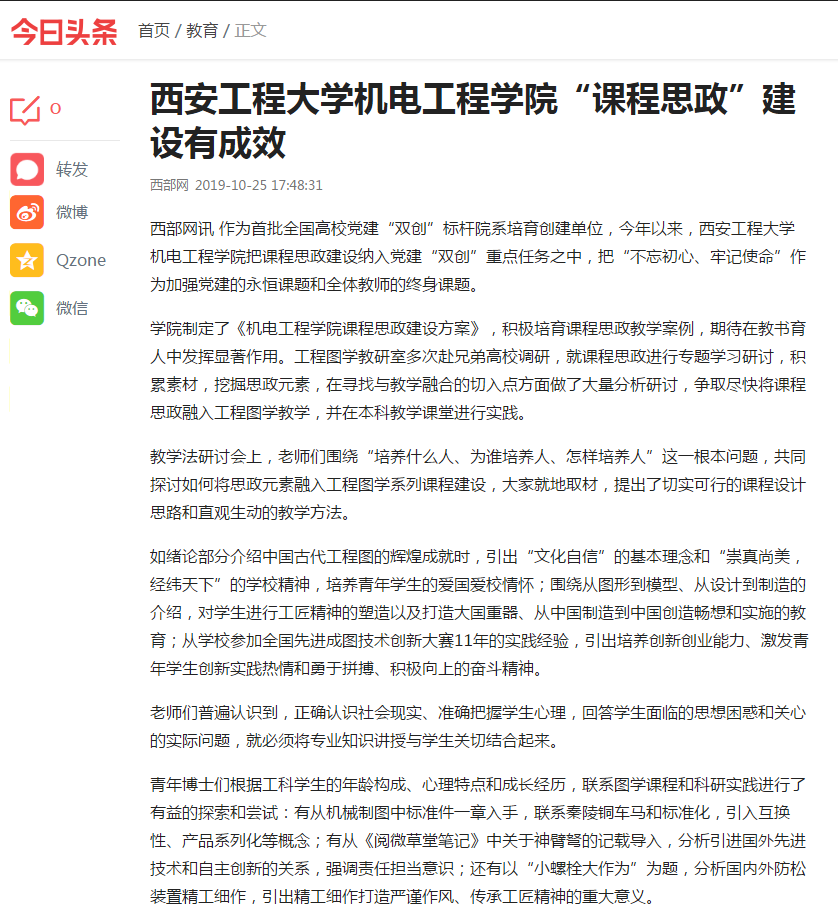 学院制定了《76net必赢线路检测中心课程思政建设方案》,积极培育课程思政教学案例,希望在教书育人中发挥显著作用。工程图学教研室多次赴陕西省兄弟高校开展调研,就课程思政进行专题学习研讨,积累素材,挖掘思政元素,在寻找与教学融合的切入点方面做了大量分析研讨,积极争取将课程思政融入工程图学教学,并在教学课堂尽早实践。