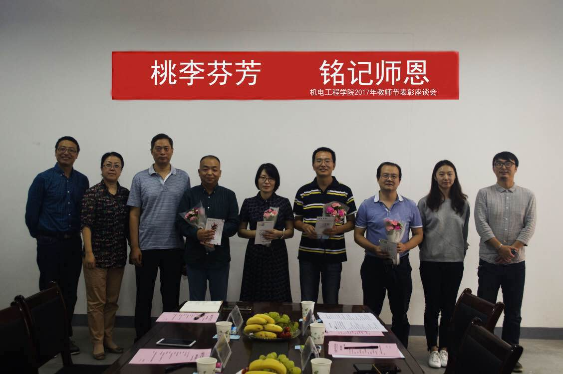 9月8日,机电学院举行“桃李芬芳 铭记师恩”教师节表彰座谈会。学院党委书记杨永革、党委副书记魏哲、办公室副主任张文磊,以及受表彰的五位教师代表(机设教研室副教授张团善、机制教研室副教授商玉林,实验中心主任、工业工程教研室副教授宋栓军,机电教研室教师周阿维、研究生秘书教师马林)和学生代表参加了会议,会议由团总支书记刘沫含主持。