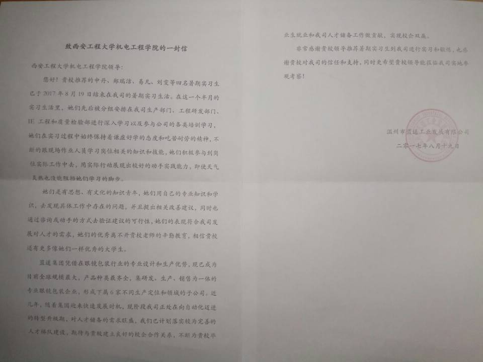 温州市蓝道工业发展有限公司创建于一九九四年,现已成为全球规模最大、产品种类最齐全,集研发、生产、销售为一体的专业眼镜包装企业。公司总部设在温州经济技术开发区滨海园区,下设印刷、浦东、浦西、龙湾四个分公司。公司拥有员工1300余人,曾多次来必赢官网进行人才招聘。实习期间,企业指定专人负责实习生的工作、学习、生活,确保实习效果和学生安全。实习生分别在企业生产部门、工程研发部门、IE工程和质量检验部门进行学习,并参与相关培训。学生在实习中发现工作中存在的问题,利用自己所学的专业知识提出建议,受到了企业高度赞扬。