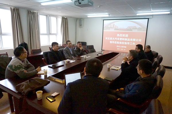 首先,胥光申介绍了学校的基本情况和政产学研用“5+X”协同创新的工作,并就机电学院的师资队伍、教学、科研等情况做了重点介绍。他希望能够与企业密切合作,充分利用学院的资源与企业开展科学研究,加快学院教师的科技成果向实际应用转化,加强双方的信息与人才交流,互惠互利,实现双赢。河北亚大汽车塑料制品有限公司副总经理郭松涛介绍了公司发展的基本情况,河北亚大汽车塑料制品有限公司是兵器工业部的第一个合资企业,公司的经营范围主要有汽车配件(包括汽车用工程塑料制品、各种管路、注塑件和相关配件)等等,在汽车管路领域处于垄断地位,占市场份额的70%,年销售额高达150亿。品牌“亚大管”经行业认可,其品牌价值达8.7亿。目前,公司以投资5000万建设了实验室,引进了先进实验设备,形成了企业自身的研发能力。郭松涛希望能与学校建立长期的合作关系,通过制定框架协议、建立实习基地等方式联合培养人才,实现双方在项目上的全面合作,达到双赢的目的。随后,双方就校企合作的具体问题进行了探讨,着重在专业学位研究生合作培养、本科卓越班实践教学、企业人才招聘、学生安全保障等方面交换了意见。