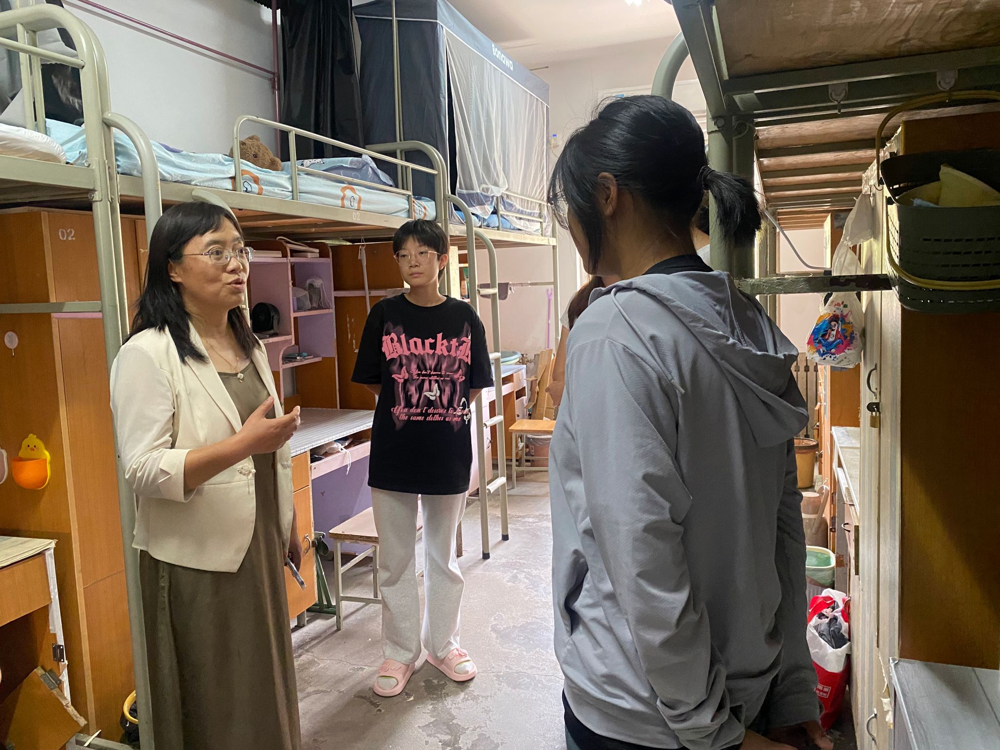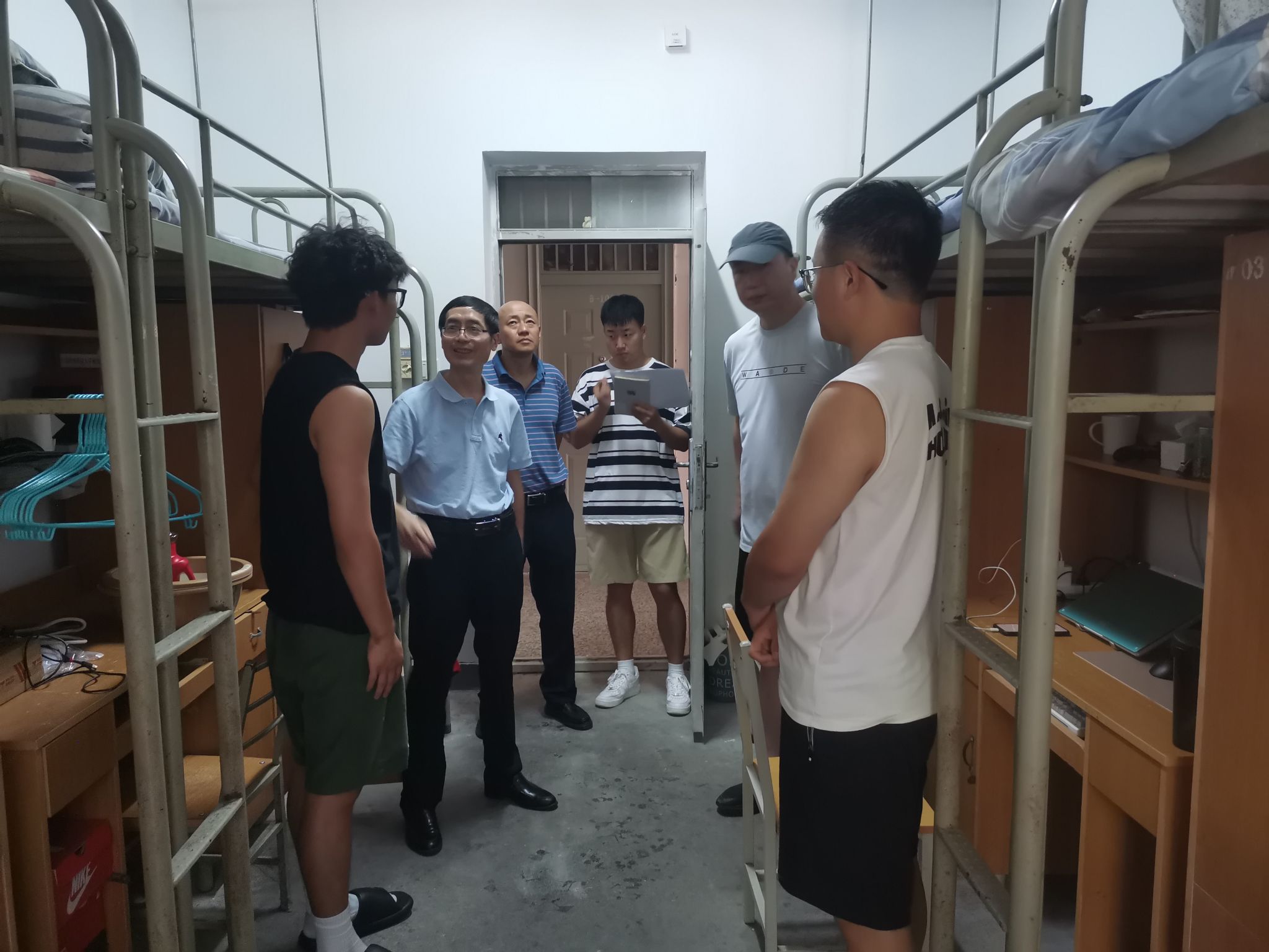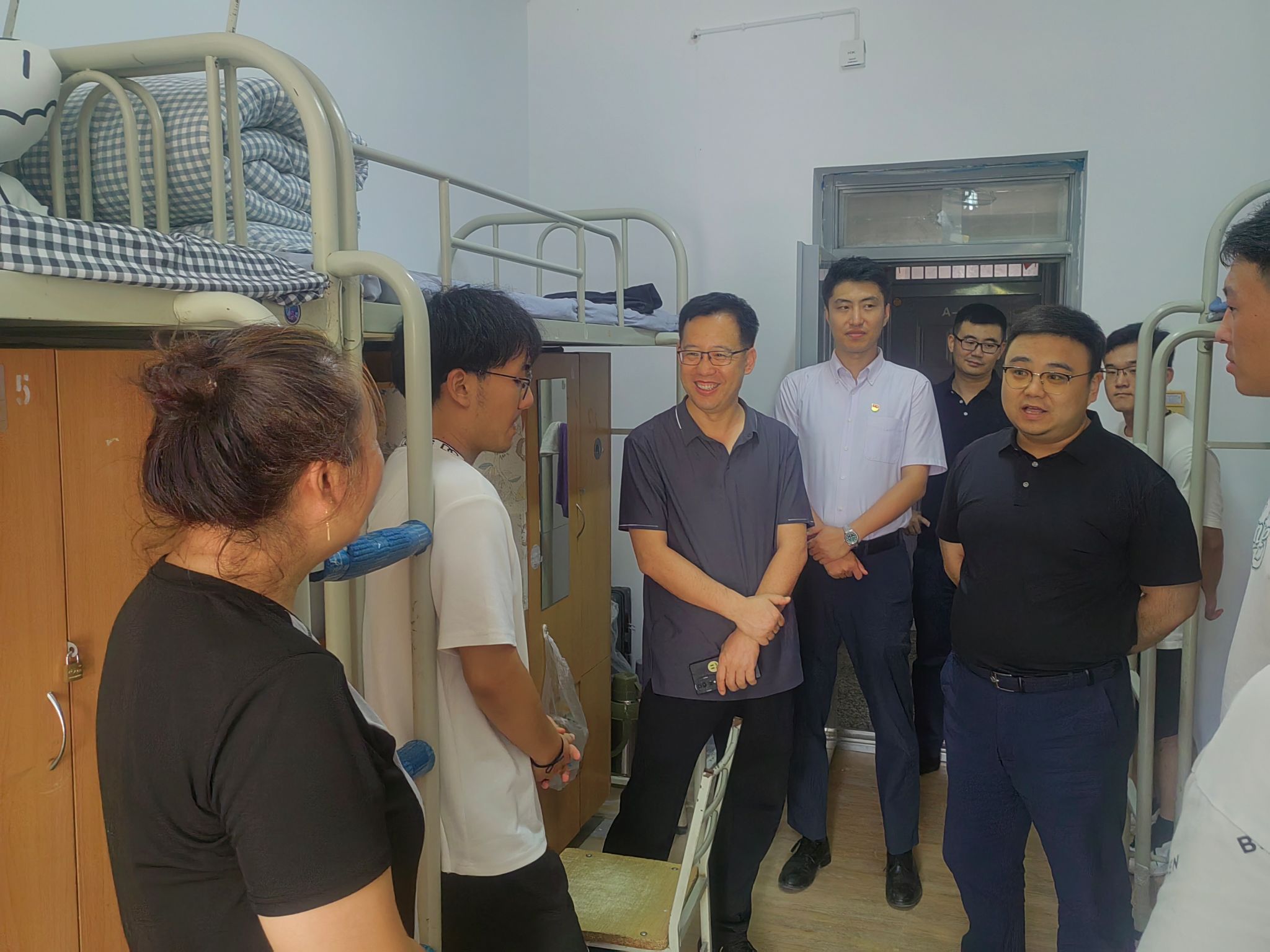 新生家长见面会后,学院全体领导与辅导员前往本硕新生宿舍,走访问候新生,了解学生基本情况,关心学生衣食住行。学院领导鼓励新生积极适应新环境新生活,刻苦学习,提高身体素质,德智体美劳全面发展,叮嘱新生有需求积极反馈,并请家长们放心,学院将以最大努力为新生提供良好的学习和生活环境,助力学生成长成才。