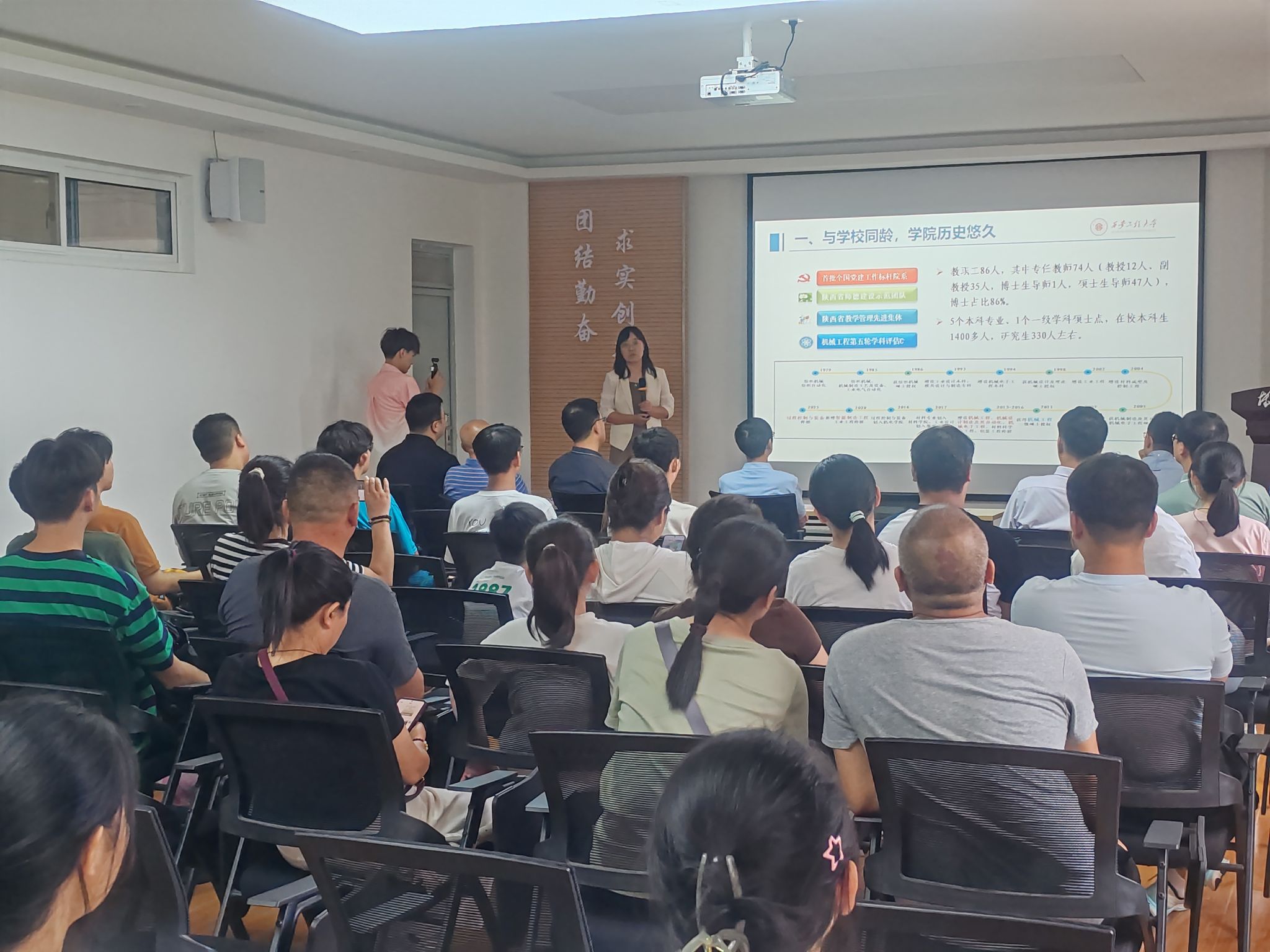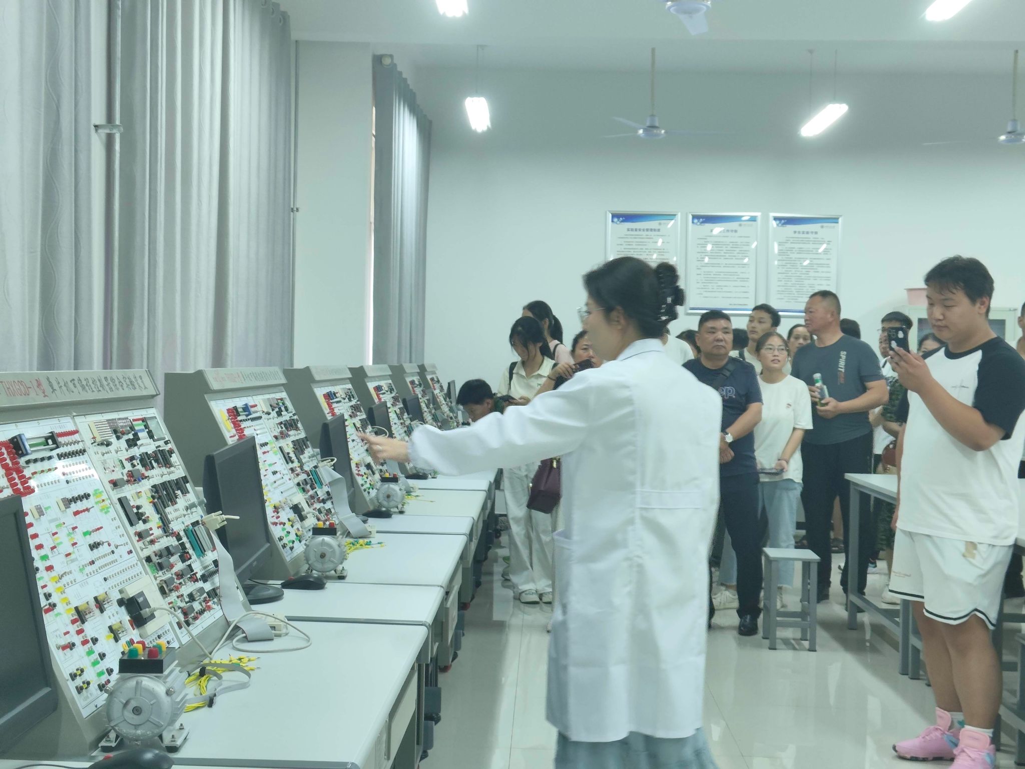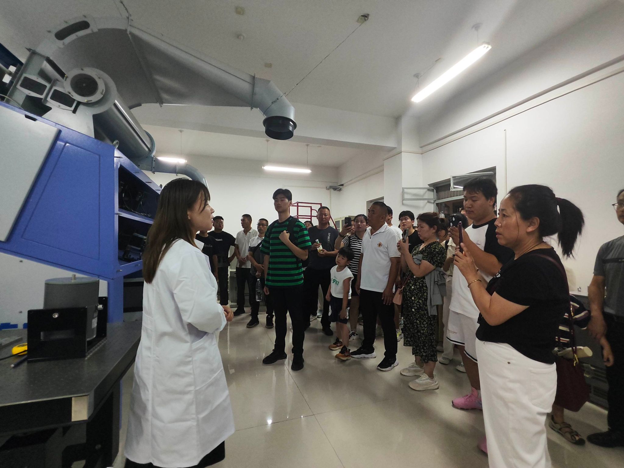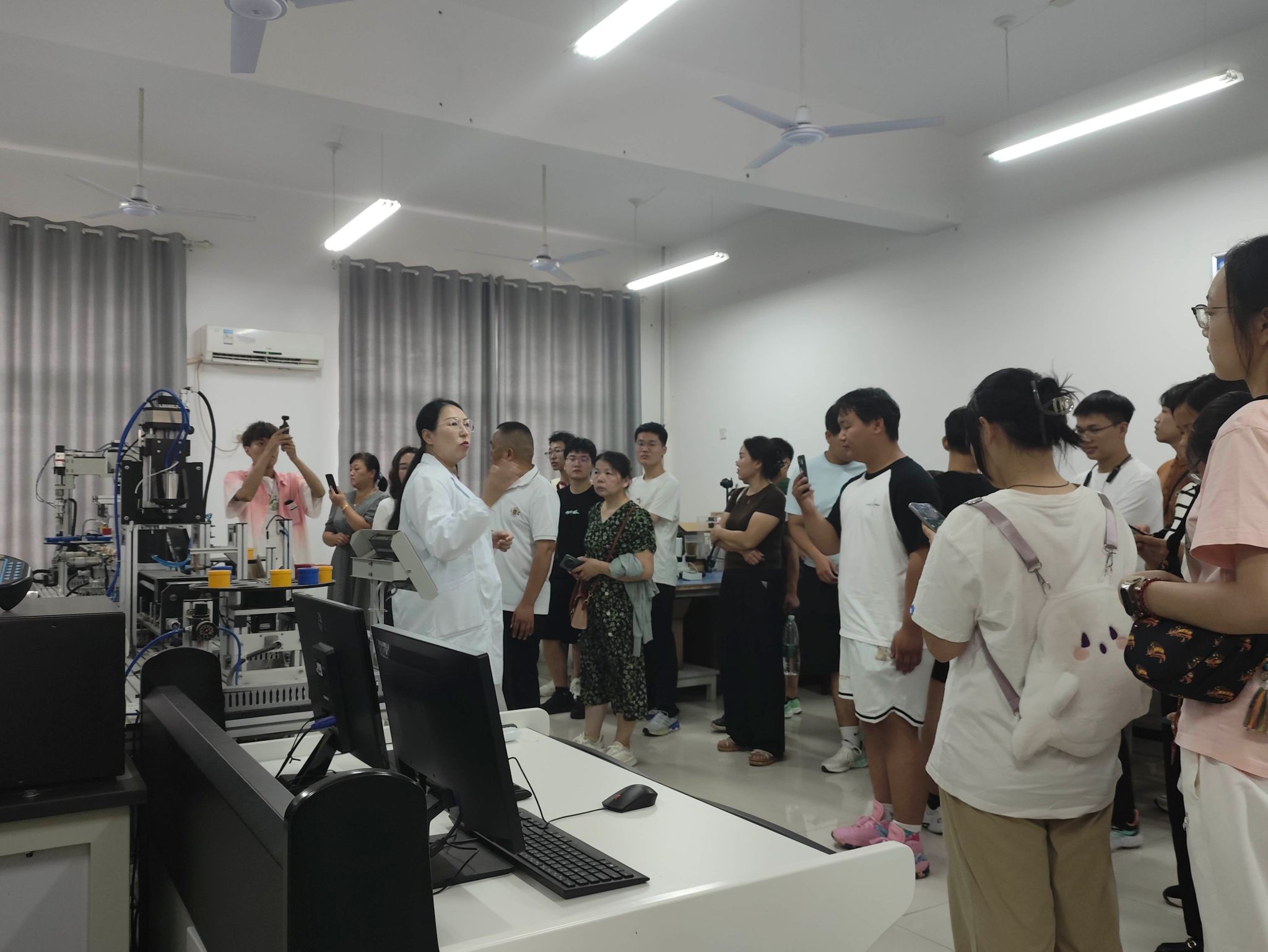第二环节,学院以网络直播的形式线上线下同步开展活动。郭方义详细介绍了学校资助政策及实施办法,并就工作中遇到特殊情况进行了说明。刘鹏作为2024级新生辅导员,用“独立、包容、自律、奉献、交流”5个关键词,对学生日常管理规定和家长关心关切的问题做了细致的讲解和全面解答。实验中心的各位老师带领家长和新生参观了智能制造、机电综合、机械创新、电液控制、纺织机械等7个机械专业实验室,向家长介绍了实验设备在本科生实践环节的具体运用,此项安排让家长们感受到学院对学生实践教学的重视,也得到家长们的一致好评。