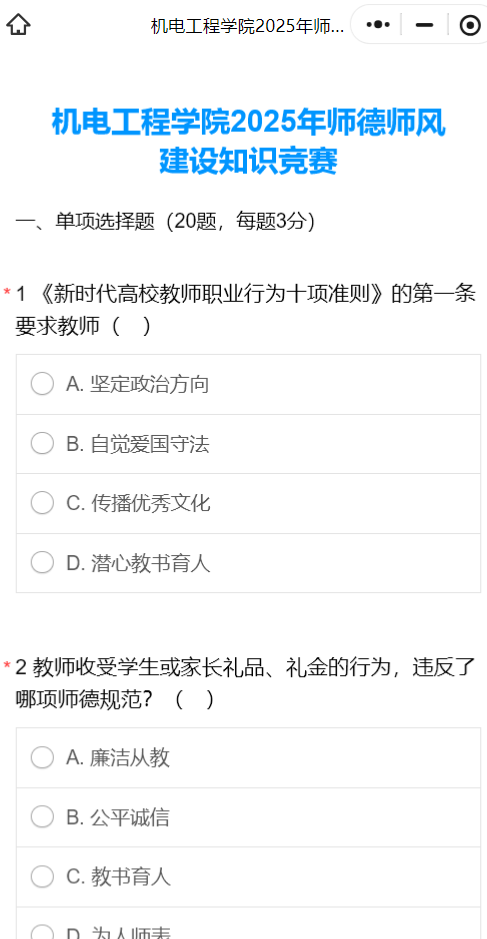 为进一步增强教师依法从教意识,规范教师依法从教行为,持续完善教职工师德师风建设,坚持师德师风建设常态化,76net必赢线路检测中心各党支部充分利用组织生活会、教学法、专题学习会、案例学习分享等多种形式广泛开展专题师德师风学习。为检验阶段学习成果,提高广大教职工学习主动性和积极性,在学院党委的部署和指导下,分工会于2025年7月8日至7月9日,以在线答题形式开展了《76net必赢线路检测中心2025年师德师风建设知识竞赛》, 50余位教职工积极参加此次竞赛,并且积极开展讨论,营造出了全员学习、共同进步的良好氛围。(撰稿:孙戬 审核:阚佩)