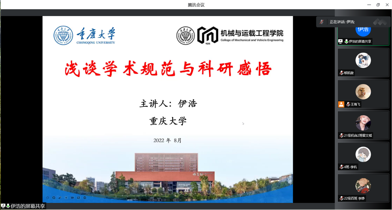 8月16日下午,重庆大学博士生导师伊浩做了题为《浅谈学术规范与科研感悟》报告。他通过讲解学术造假的典型案例以及切身科研感悟,告诫同学们科研诚信是科技工作者的生命,要遵守科研红线,规范论文写作,避免学术不端。