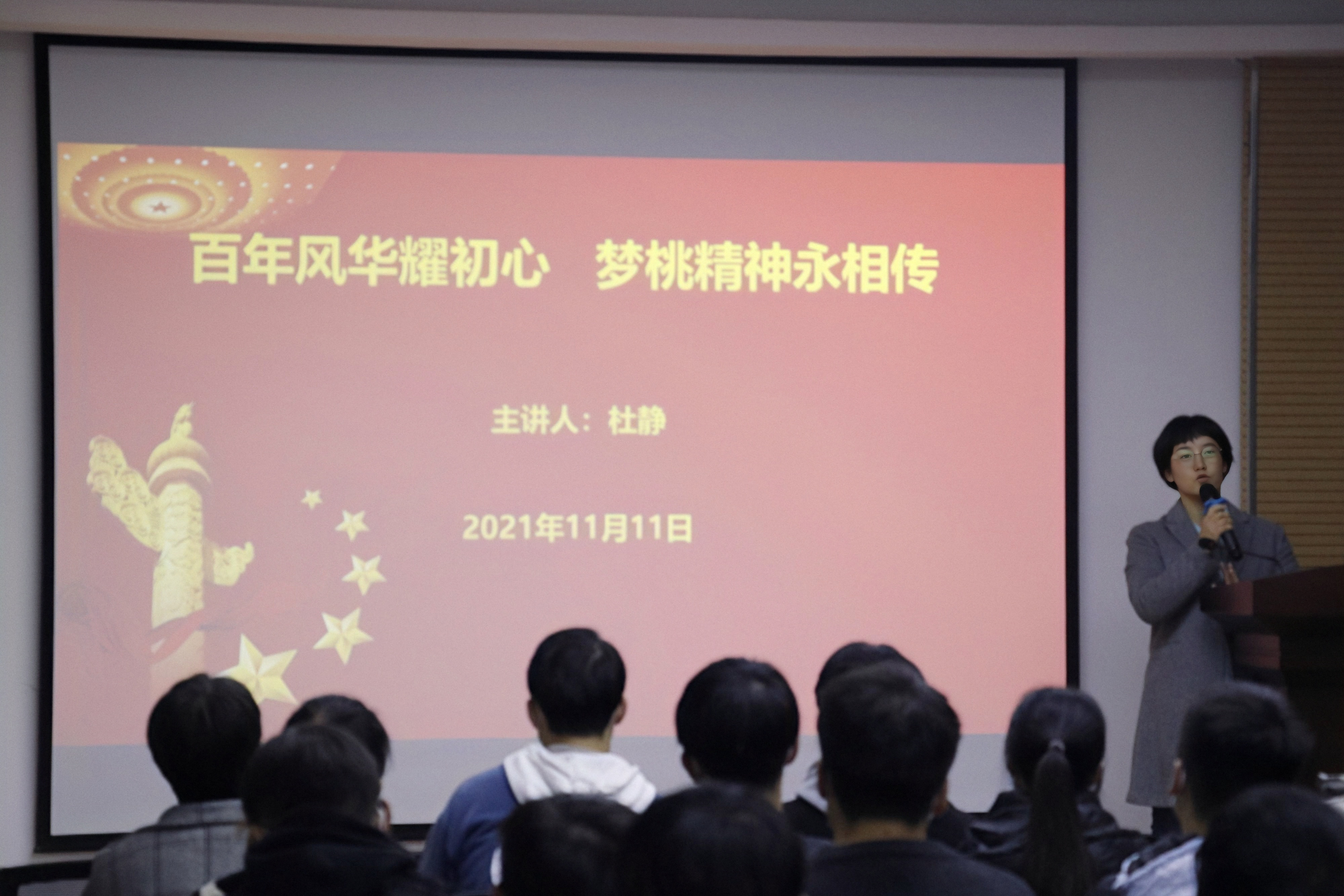 2021年11月11日晚,76net必赢线路检测中心力行致远导师团举办“百年风华耀初心梦桃精神永相传”主题党日活动,机制学生第二党支部书记杜静讲授了专题党课,50多名学生党员参与活动。