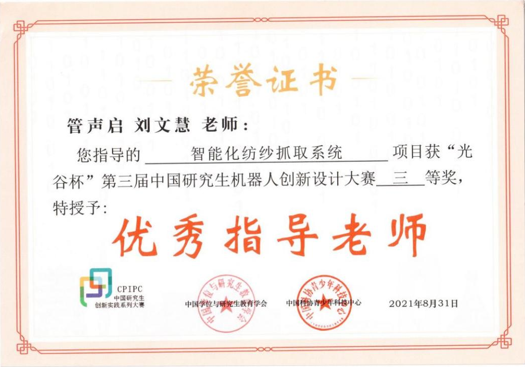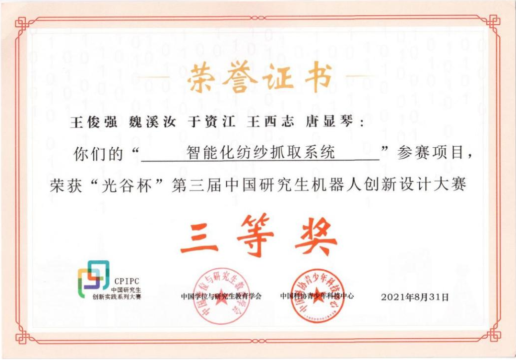 2021年8月24日至25日,“光谷杯”第三届中国研究生机器人创新设计大赛全国总决赛在线上举办。经过激烈角逐,必赢官网76net必赢线路检测中心管声启教授、刘文慧副教授指导的硕士研究生王俊强、魏溪汝、于资江、王西志、唐显琴等五位同学的参赛作品《智能化纺纱抓取系统》入围全国总决赛并荣获国家三等奖,指导教师获得优秀指导教师称号,同时必赢官网荣获全国“优秀组织奖”称号。