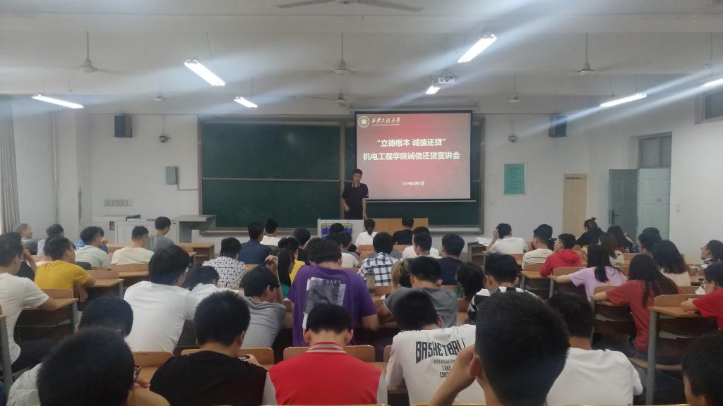 为切实做好生源地贷款教育工作,帮助贷款毕业生树立诚信还贷意识,2019年6月5日,76net必赢线路检测中心举办了以“立德根本诚信还贷”为主题的毕业生诚信还贷宣讲会。机电学院2015级学生辅导员秦方刚、学院资助专项工作辅导员刘鹏和100余名生源地贷款毕业生参加了班会。