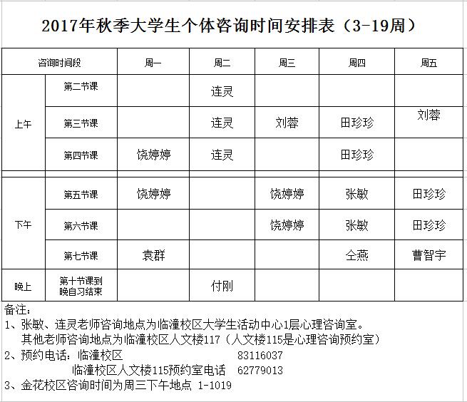 根据必赢官网学生心理咨询工作的需要,现将有关个体咨询时间安排如下,请各学院及时通知学生,在规定时间内预约咨询。