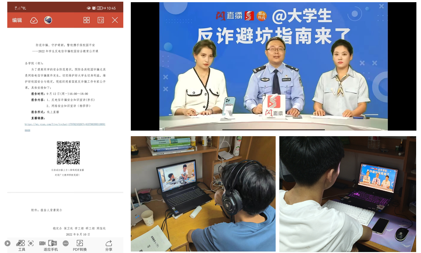 9月9日、12日、14日,学院积极组织2022级新生收看由市公安局等部门联合举办的【@大学生反诈避坑指南来了】主题线上直播活动,由76net必赢线路检测中心举办的《防范诈骗、守护萌新,警校携手保校园平安——2022年学生反电信诈骗校园安全警示公开课》,由76net必赢线路检测中心举办的《开学季防诈防骗知识宣讲会》《新生安全教育》,通过众多典型案例,不断提升学生安全防范意识,预防各类校园诈骗案件发生,切实维护好大学生切身利益,维护好校园安全稳定。9月12日,学院邀请大学生心理健康教育与咨询中心副主任田珍珍从新生面临的三大变化、新变化带来的新冲突、新生心理调适方法集锦等3个方面做了大学新生心理适应的专题报告,同学生感兴趣的话题进行了深入互动,帮助新生明确方向,从“心”保驾护航。